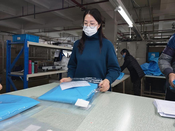 當(dāng)天晚上,紅豆國際黨委書記戴敏君立即號召黨員干部赴生產(chǎn)“前線”支援,于是3月1日早上7點(diǎn),在一線生產(chǎn)車間,出現(xiàn)了紅豆500多名黨員干部包裝“戰(zhàn)衣”,帶領(lǐng)始終在一線堅(jiān)守的廣大員工一起加油干的火熱場面。