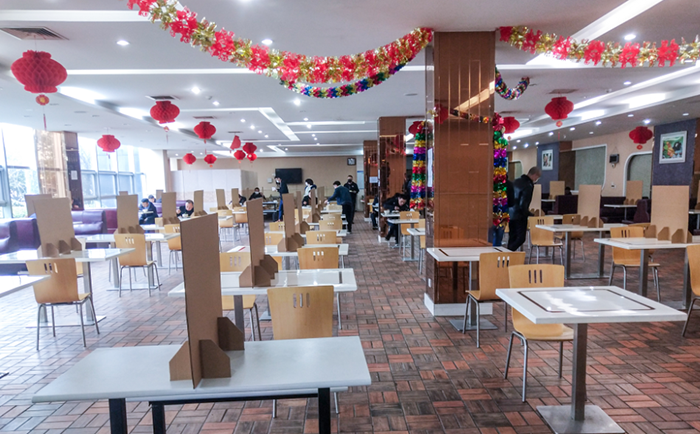 兵馬未動糧草先行。在復(fù)工之前,公司利用現(xiàn)有資源通過各種渠道采購了大量口罩,防護(hù)服、酒精、消毒液等防疫物資也已全部到位。公司食堂實(shí)行人員錯峰分流措施,員工就餐分時(shí)分批、限時(shí)限流,避免人員在食堂中聚集,進(jìn)食堂前需檢測體溫,排隊(duì)取餐需間隔一米,每桌限坐2人,中間用板隔開,且一律同向而坐,避免隔桌交談。