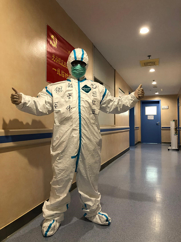 遠在武漢的殷晉偉醫(yī)生知道這些事情后深為感動,為了表達對紅豆物業(yè)人的感激之情,特意在防護服上寫了“感恩紅豆”并拍照發(fā)給張偉。他說,感恩紅豆物業(yè)對我家庭細致入微的照顧,徹底解除了“后方之憂”,使他在戰(zhàn)疫一線能夠安心工作。
